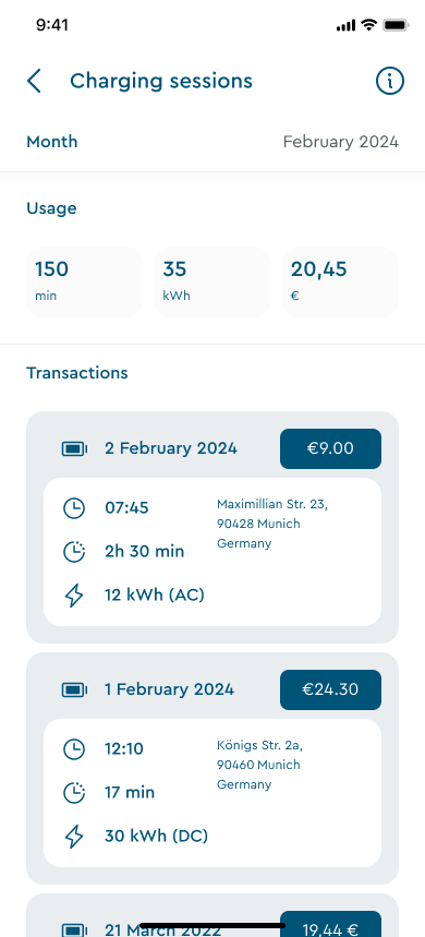 Track your charging history in a comprehensive overview per month and in single transaction details.